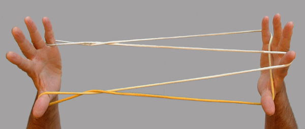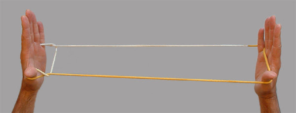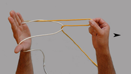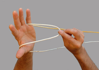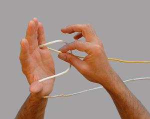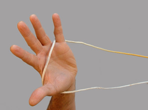 | Position I (main gauche). Attraper avec D1et D2 le fil palmaire de la main droite et le tirer vers la droite (d'une dizaine de cm). | |