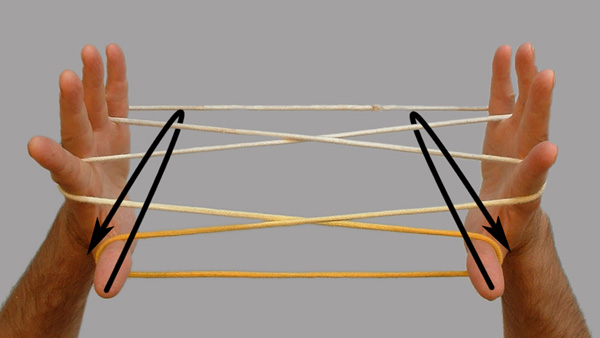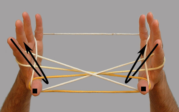 | Par le côté proximal, insérer 2 dans les boucles 1 proximales, saisir les fils 1 ulnaires proximaux, et revenir en position. Libérer 1. |